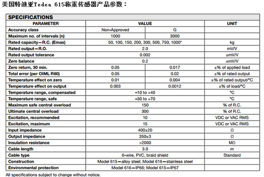 tedea 615-750kg由不銹鋼制成,耐濕度涂料和屏蔽電纜使這些稱重傳感器可以在惡劣的環境中使用,同時保持其操作規范。額外的感應線補償的變化由于溫度變化和/或電纜的引線電阻擴展名。應用機電結合秤、皮帶秤、筒槽計量、測力系統、配料秤、定量系統等。(英譯:Tedea 615-750kg by stainless steel, resistant to moisture coating and shielded cable make these weighing sensor can be used in harsh environment, while maintaining its operation specification. An additional line of induction compensation change due to temperature change and/or the lead resistance of the cable extension. Used mechanical and electrical combination scale, belt scale, cylinder tank metering, load system, batching scale, quantitative system, etc.)