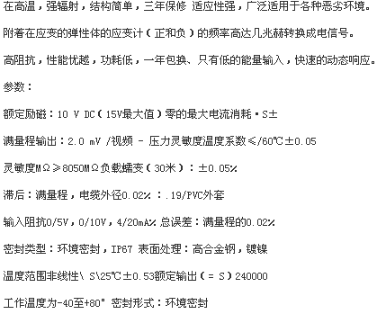 據資料,該低溫型脈動壓力傳感器屬于電阻應變式壓力傳感器。傳感器采用離子束濺射薄膜技術,在金屬膜片上直接生成電介質隔離膜和功能材料電阻膜(薄膜應變電阻),在電阻膜上制作應變電阻,組成惠斯通電橋。當被測介質的壓力發生變化時,應變電阻阻值也隨之變化,從而使傳感器輸出電壓值發生變化。傳感器金屬膜片上還制備了一個測溫電阻,通過測溫電阻,當傳感器的工作環境溫度發生變化時,測溫電阻阻值也隨之變化,并提供給變換器,通過變換器獲取工作環境溫度。低溫型脈動壓力傳感器系統具有使用測量低溫區寬的特點,傳感器使用溫度范圍為-253℃~ 60℃(液氫溫度);測量范圍:(0~60))MPa。