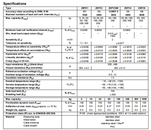 Z6 稱重傳感器有多種不同的型號 (Z6FD1, Z6FC3, Z6FC3MI, Z6FC4, Z6FC6) 并有不同的精度等級.