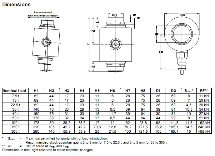 這款測力傳感器開發用 于大容量集裝箱和料倉稱重系統。也可用于靜態力值測量應用。型號 F1270 系列的額定負載為 7.5 t 到 300 t。雙側受力點采用球面結構的搖臂銷設計是這款測力傳感器的獨特特征。