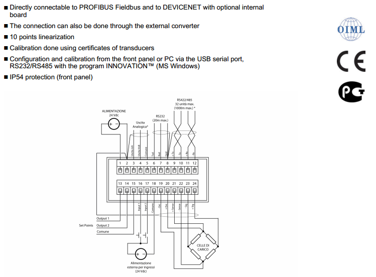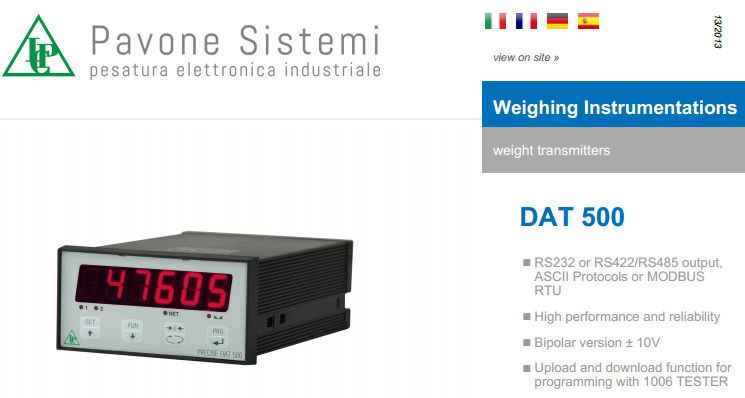 DAT500重量變送器,是由意大利Pavone Sistemi Sistemi SRL公司生產,原裝進口。該稱重變送器具有模擬量和Modbus通訊兩種輸出方式,還可選擇Profibus和DeviceNet輸出,精度高,壽命長。