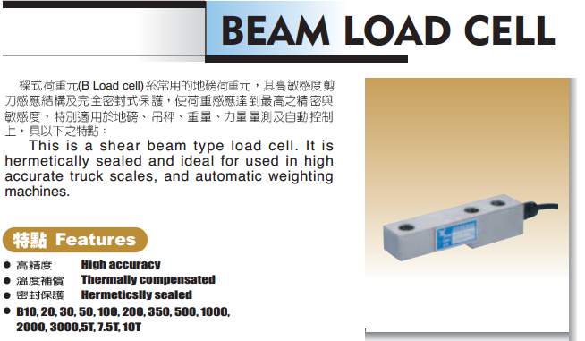 臺灣JIHSENSE B型荷重元( B Load cell)系常用的地磅荷重元,其高敏感度剪刀感應結構及完全密封式保護,使荷重感應達到最高 之精度與敏感度,特別適用於地磅、吊秤、重量、力量量測及自動控制上,具以下之特點: