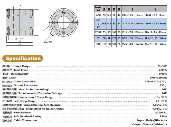 本LRM型荷重元(LRM Load cell)施力點與固定點在同一軸線上,並採用原柱型結構,安裝容易且非常穩固,本型荷重元並以外殼保護感應部份,非常精確,堅固耐用。適用於吊秤及各式重量及力量量測上,具以下之特點: