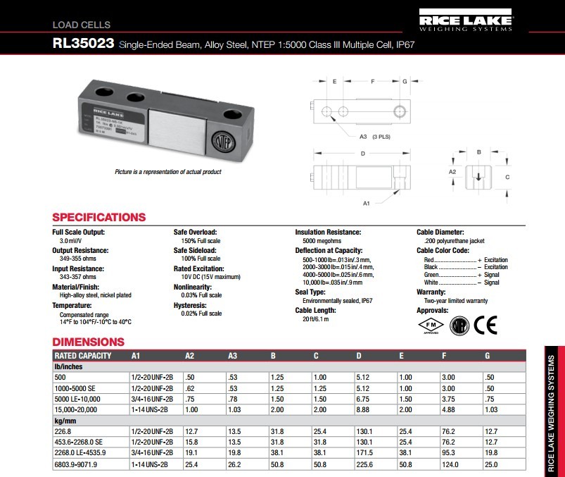 RICE LAKE RL35023單端梁設計,低調的尺度和各種流程應用程序。從1000到10000lb(453.6kg至4535.9kg的),非NTEP細胞在500lb,15,000lb及20,000lb容量(226.8kg至9071.9kg的)NTEP認證的能力。