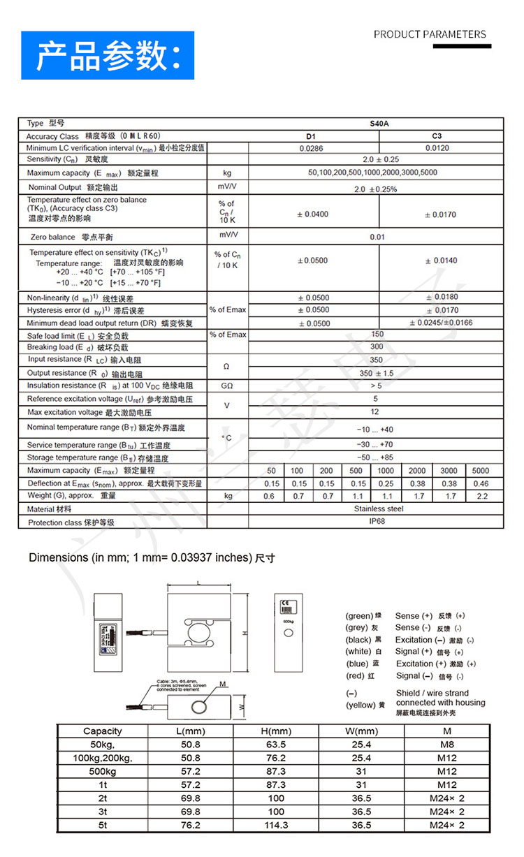 德國HBM S40A稱重傳感器產品參數: