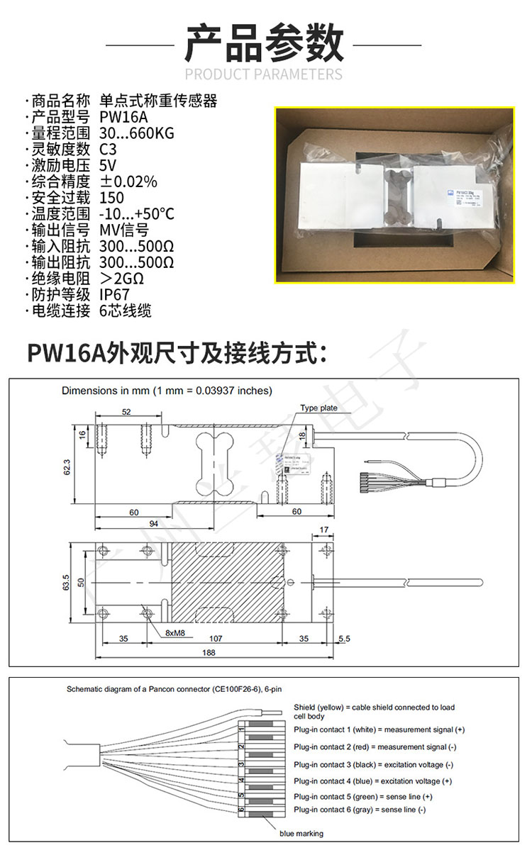 PW16AC3/100KG稱重傳感器6-wire circuit