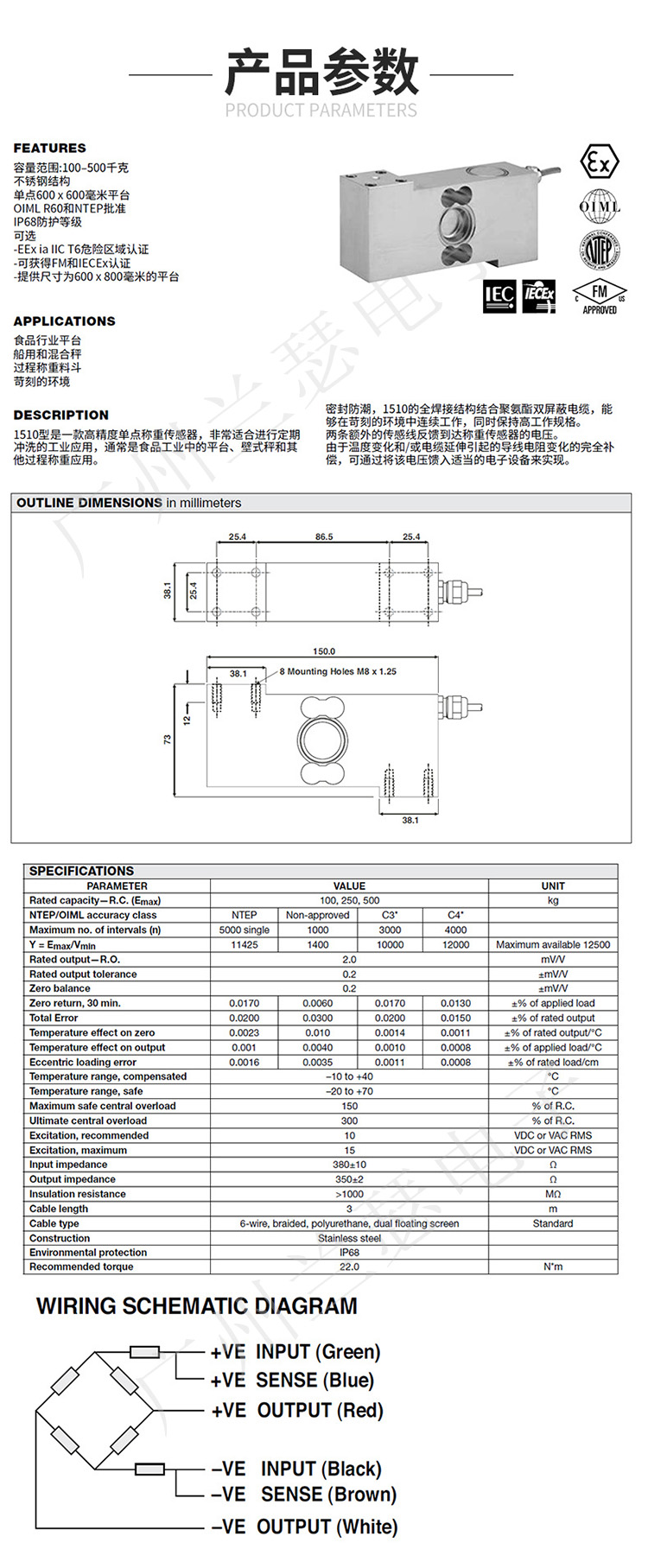美國Tedea 1510-100kg稱重傳感器產(chǎn)品參數(shù):