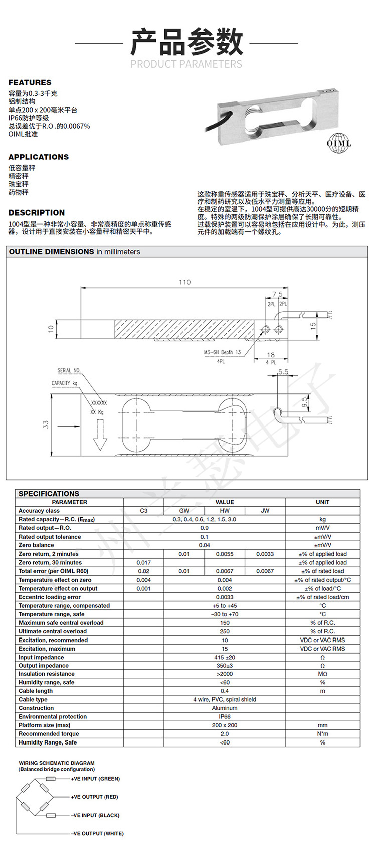 美國Tedea 1004-0.6KG稱重傳感器產品參數:
