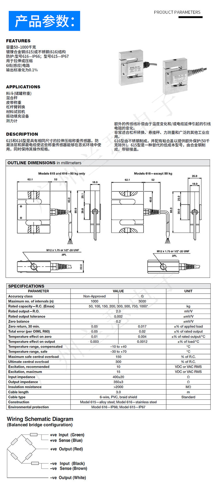美國Tedea 615-100kg稱重傳感器產品參數:
