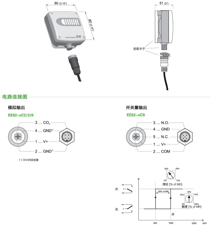 EE82測量范圍為 0...2000 / 5000 / 10000ppm,可選擇0-5/10V4-20mA的模擬信號輸出,也可以選擇帶有報警設定點和回差設定點的開關信號輸出。使用卡座式安裝法蘭和信號連接插頭,無須打開外殼,就可以方便安裝變送器。